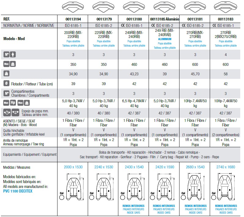 RIB avec tableau arriére pliable et un espace pour 3 personnes et poids maximum de 350kg.